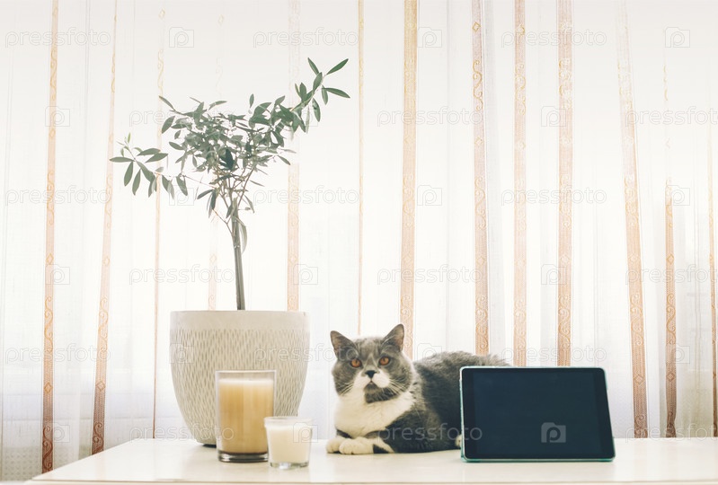 Серая кошка шотландской породы отдыхает дома на столе. Образ жизни домашних животных