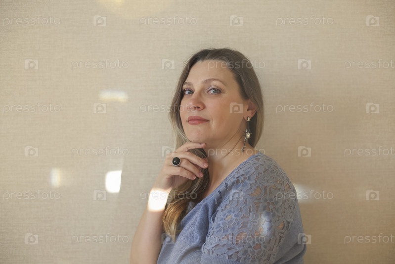 Любите себя в любом возрасте. Женщина средних лет нежно касается подбородка рукой и смотрит в камеру