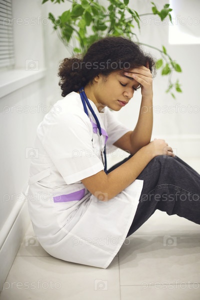 Грустная уставшая молодая афроамериканская медсестра сидит на полу в клинике, чувствуя себя перегруженной работой