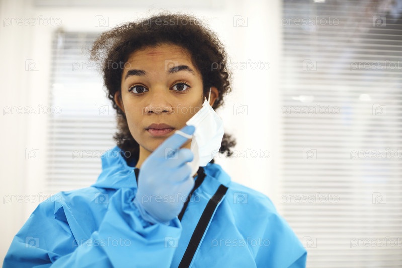 Уставшая разочарованная афроамериканка-медик в защитном снаряжении снимает маску