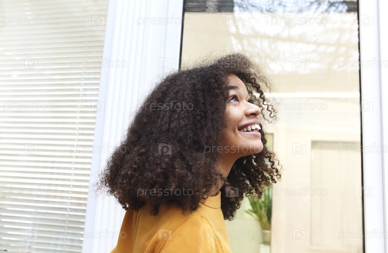 Счастливая позитивная молодая африканская американка смотрит вверх и улыбается, стоя у окна дома