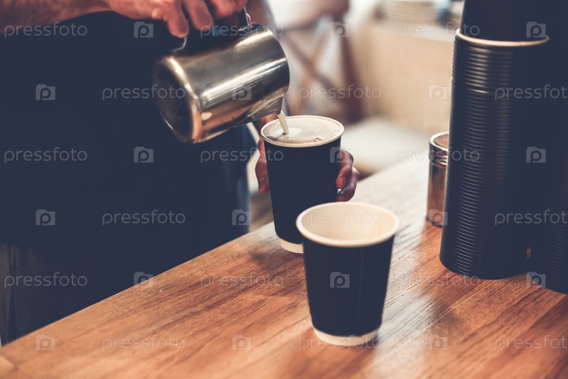 Урожай бариста наливает горячее молоко из железной кружки в кофейные чашки