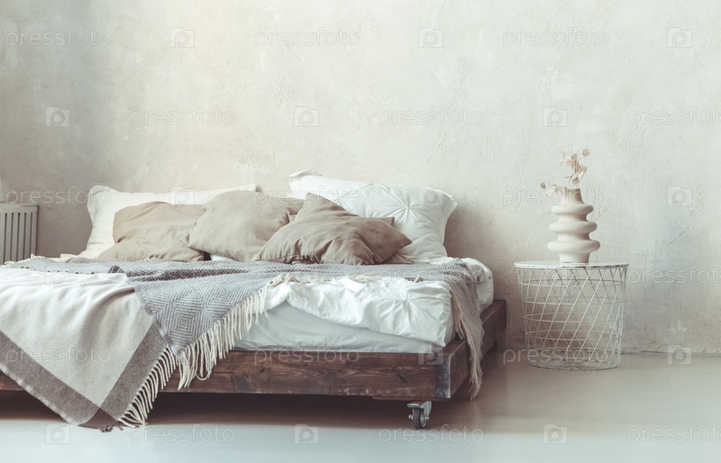 Стильный минималистский интерьер спальни в стиле лофт с кроватью и металлической круглой тумбочкой