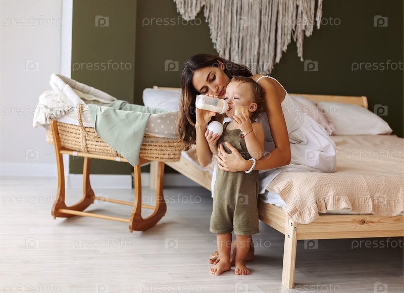 Молодая любящая мать держит ребенка за руки и кормит сына мальчика молоком из бутылочки
