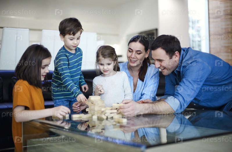 семья с маленькими детьми сидит в солнечной гостиной и берет блоки из башни