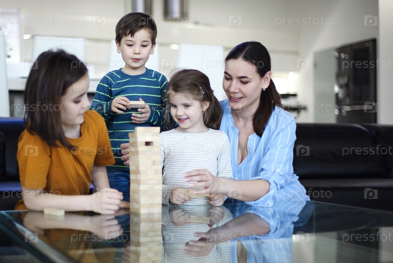 семья с маленькими детьми сидит в солнечной гостиной и берет блоки из башни