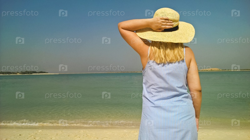 Молодая женщина в летнем платье с соломенной шляпой