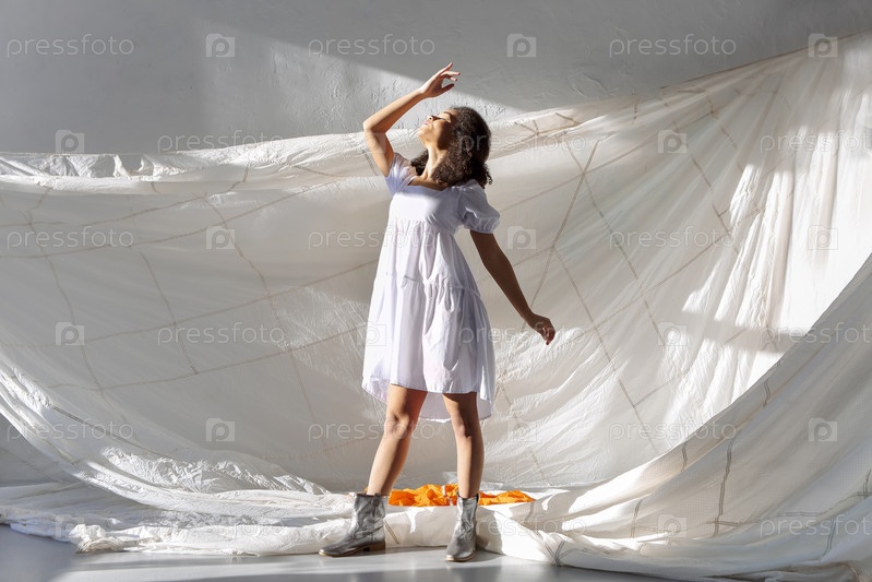 Прыгай и лети. Молодая счастливая беззаботная африканская американка прыгает в воздух с большой белой тканью