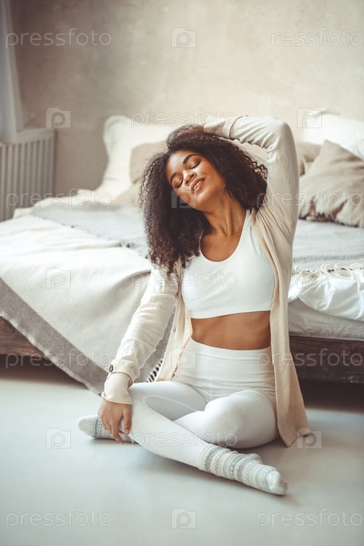 Веселая очаровательная афроамериканка с вьющимися волосами в спальне