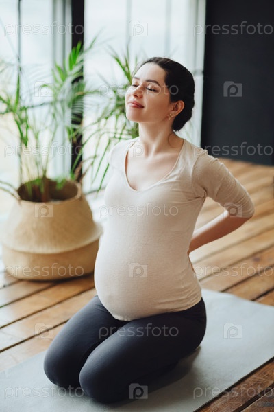 Медитация во время беременности. Молодая спокойная спокойная беременная женщина занимается йогой дома, медитирует и практикует осознанность, будущая мать сидит в позе лотоса с закрытыми глазами