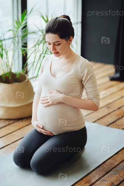 Медитация во время беременности. Молодая спокойная спокойная беременная женщина занимается йогой дома, медитирует и практикует осознанность, будущая мать сидит в позе лотоса с закрытыми глазами