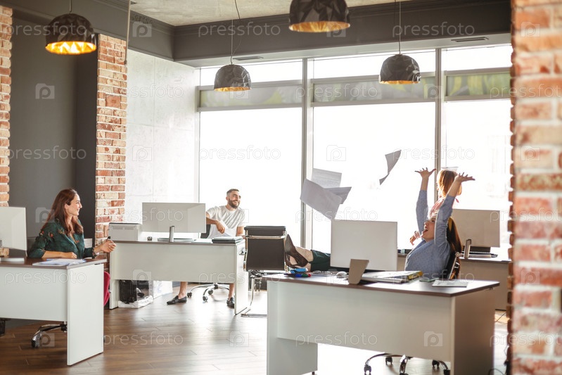 Офисные работники празднуют завершение проекта