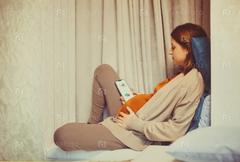 Беременная женщина держит смартфон с помощью приложения для отслеживания беременности на мобильном телефоне, сидя в помещении