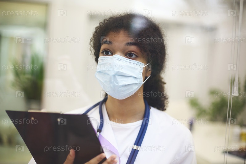 Молодой уставший переутомленный афроамериканский медицинский работник в защитной маске с рентгеновским сканированием в руках смотрит наружу