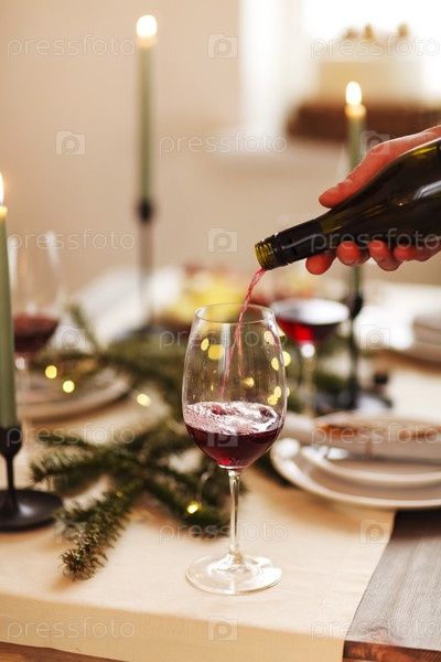 Свечи и вино на рождественском столе. Мужчина подает вино во время ужина