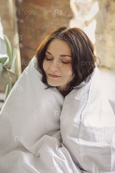Портрет молодой красивой счастливой женщины, сидящей в одеяле с закрытыми глазами