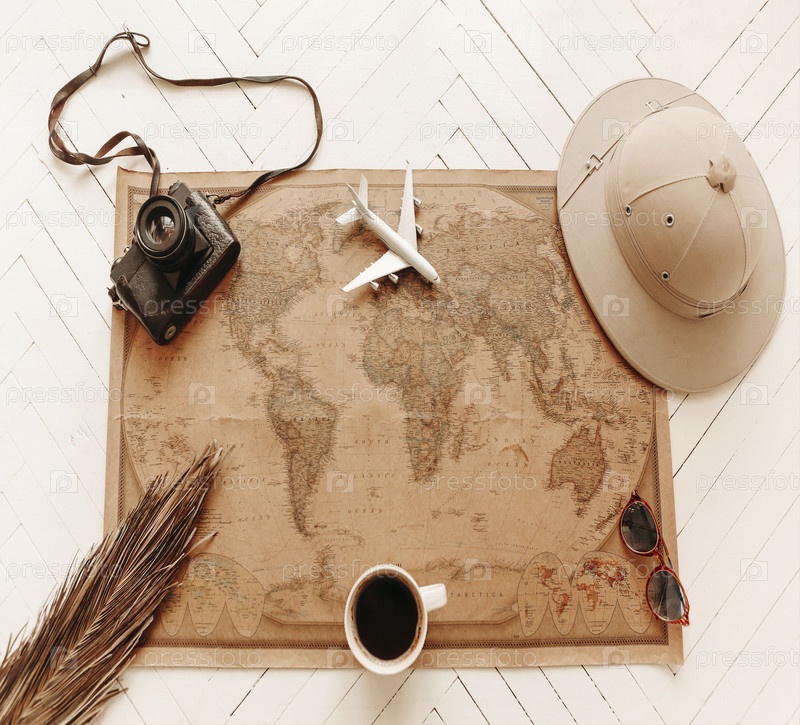 Вид сверху на винтажную карту мира с объектами, связанными с путешествием, экскурсиями и турами