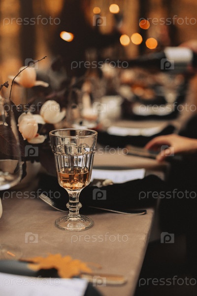 Избирательный фокус на высоком бокале с белым вином, стоящим на обеденном столе после праздничного банкета