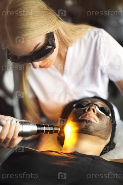 Косметолог держит косметический лазер рядом с лицом женщины, покрытым углеродной маской и защитными очками