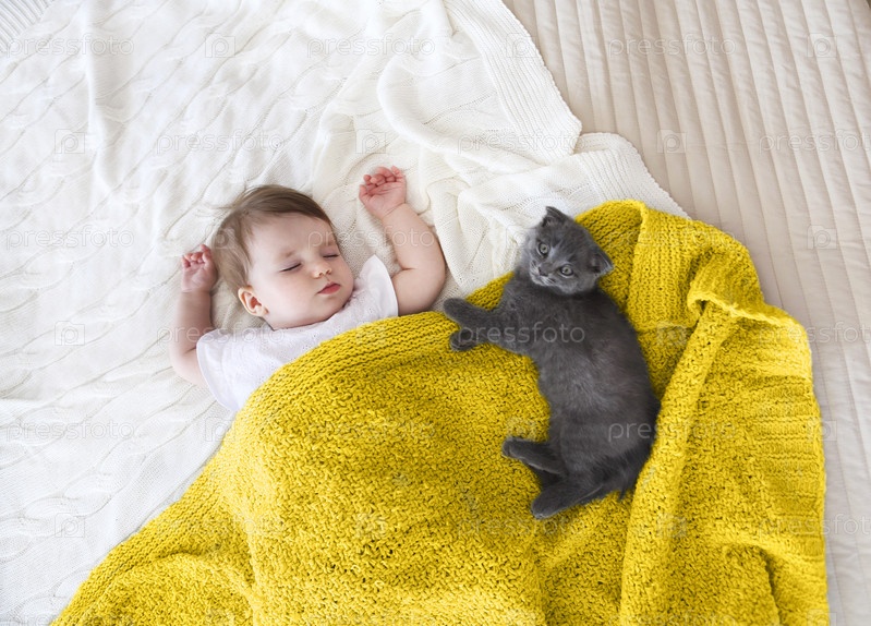 портрет красивого спящего ребенка и котенка