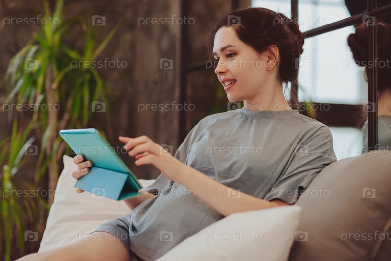 Молодая улыбающаяся беременная женщина держит цифровой стол и делает видеозвонок, сидя дома на кровати