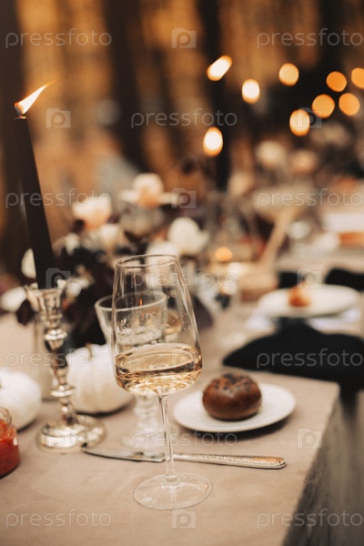 Избирательный фокус на высоком бокале с белым вином, стоящим на обеденном столе после праздничного банкета