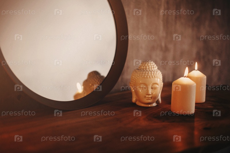 Круглое зеркало на деревянной полке с двумя горящими свечами и маленькой фарфоровой головой Будды