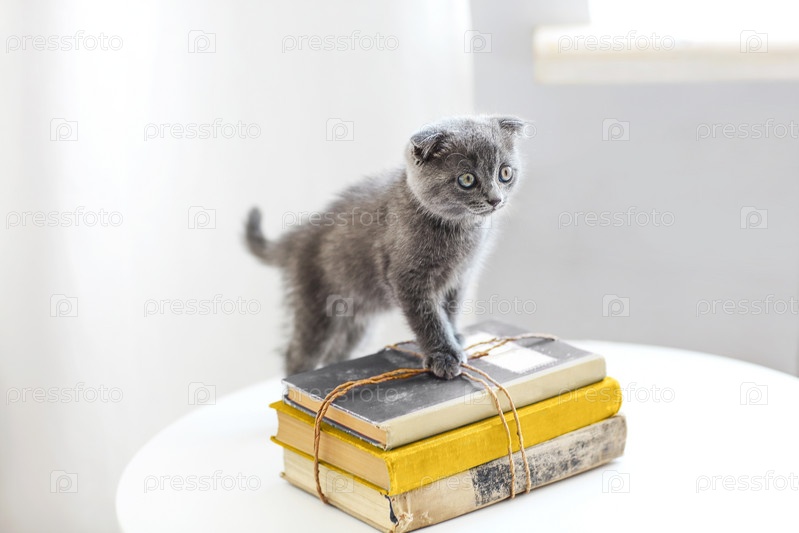 Симпатичный серый шотландский котенок сидит на куче книг в гостиной