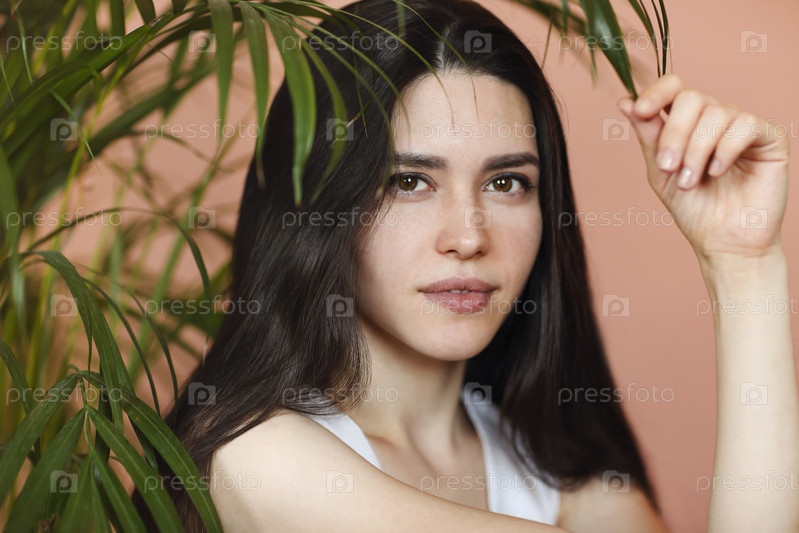 Молодая брюнетка возле зеленого растения