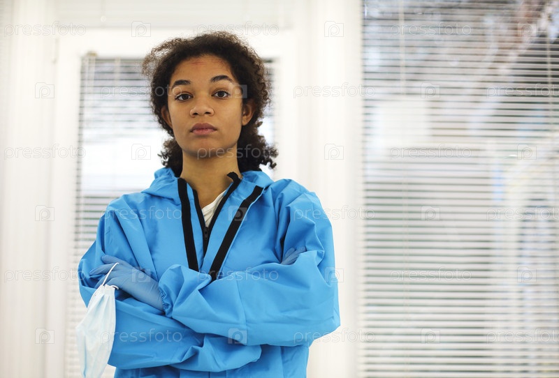Портрет молодого уставшего афроамериканского медицинского работника или медсестры в защитном снаряжении, снимающего маску