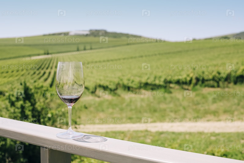 Бокал с красным вином на фоне виноградника
