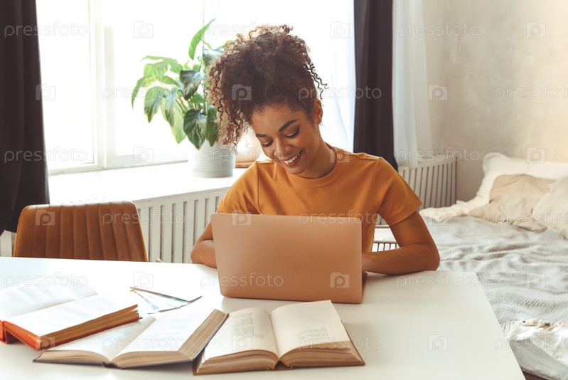 Веселая молодая афроамериканская студентка, сидящая дома за партой в окружении учебников, перед ноутбуком, усердно изучая, готовится к экзаменам онлайн,
