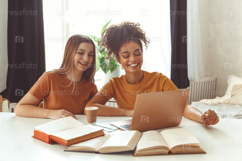Две счастливые подруги сидят перед ноутбуком и вместе готовятся к экзаменам дома