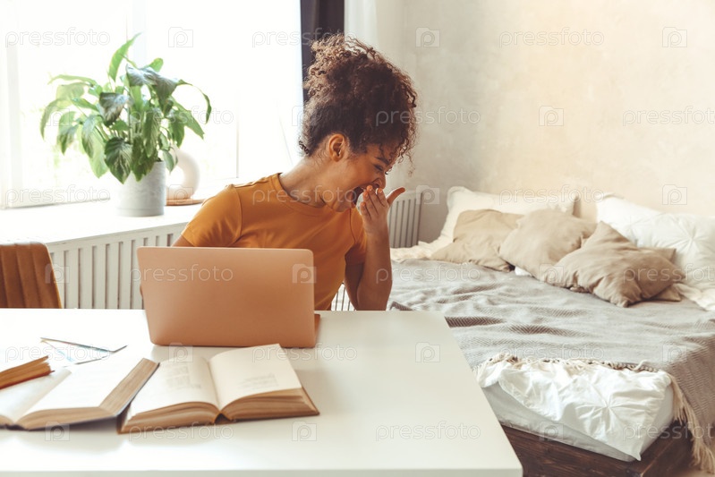 Усталая взволнованная молодая девушка африканского происхождения сидит за столом перед ноутбуком, зевая прикрывая рот рукой, не испытывая энтузиазма к работе или учебе