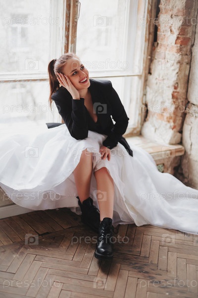 Счастливая стильная женщина у окна