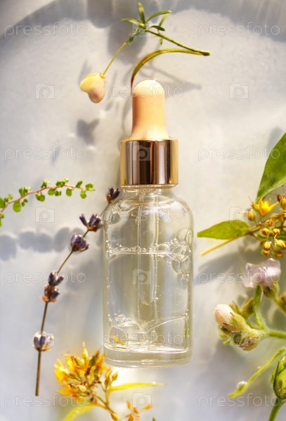 Бутылка эфирного масла возле цветов