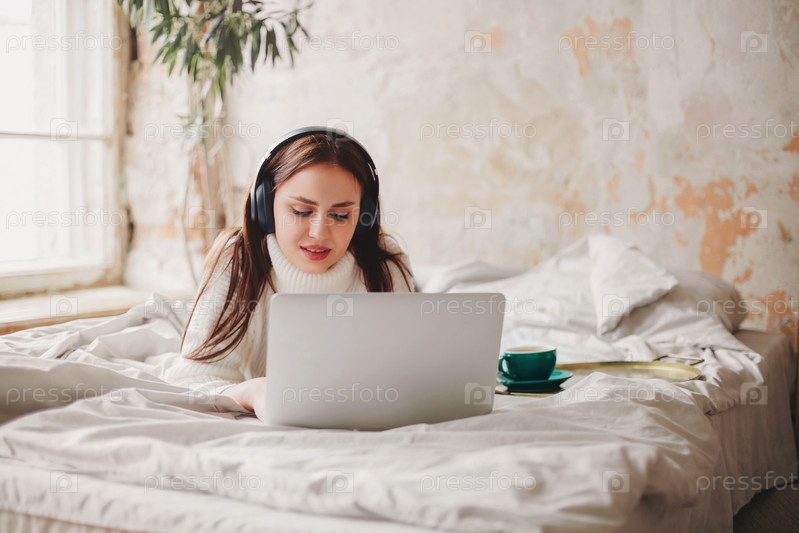 Молодая женщина с помощью ноутбука на кровати