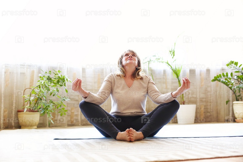 Зрелая женщина растягивает тело на полу