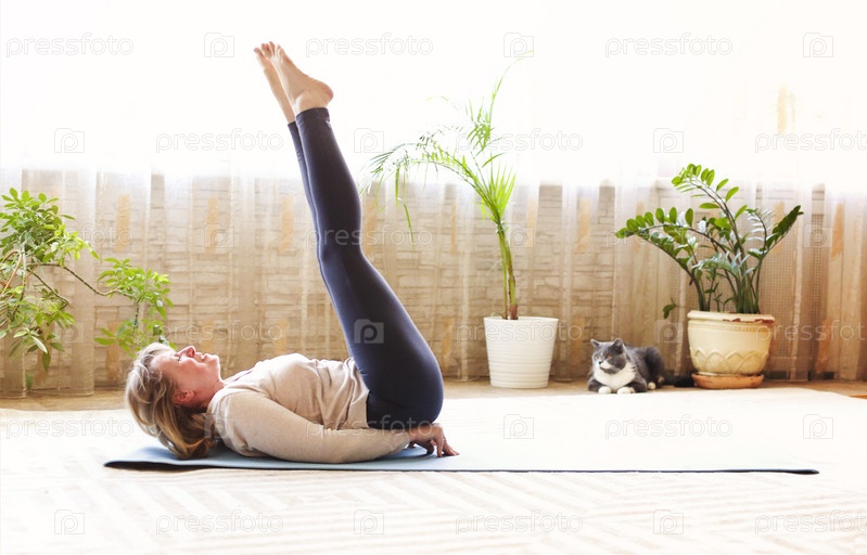 Зрелая женщина растягивает тело на полу