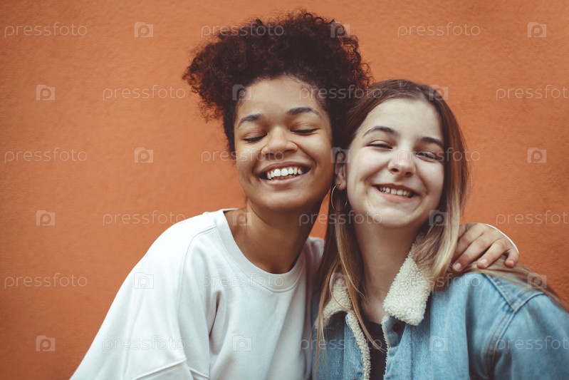 Портрет двух счастливых радостных девочек-подростков разных рас, делающих селфи, наслаждающихся дружбой