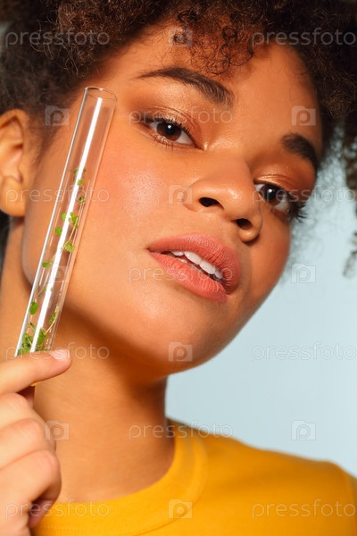 Улыбающаяся афроамериканка держит перед лицом стеклянную пробирку с микрозеленью. Суперфуд
