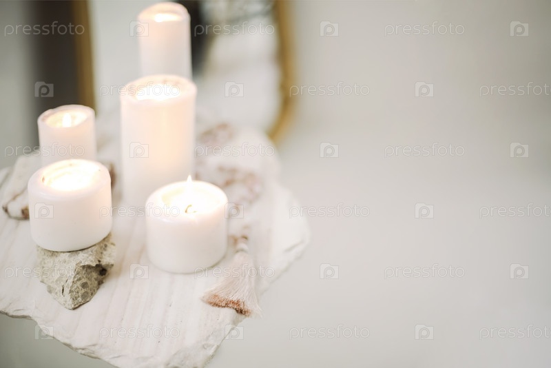 Фото горящих свечей разного размера и четок на подставке из камня и бетона