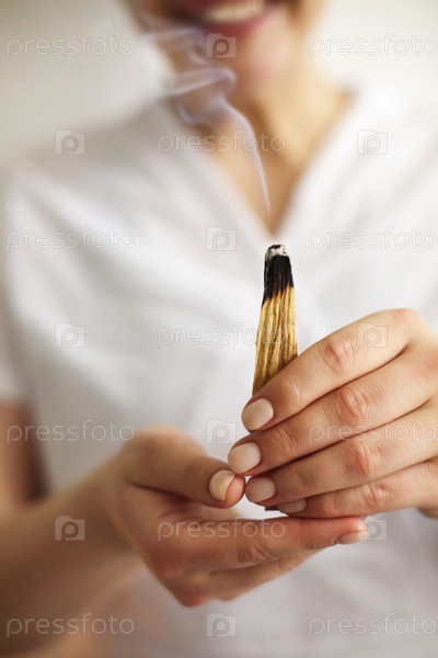 Обрезанный снимок улыбающегося работника СПА в белой форме, держащего в руках горящие благовония пало-санто