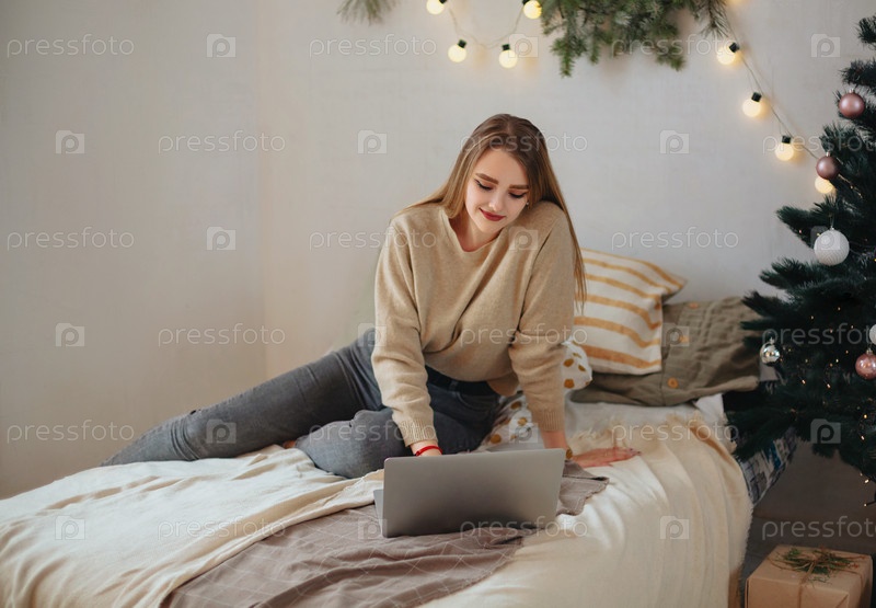 Веселая женщина с ноутбуком на кровати