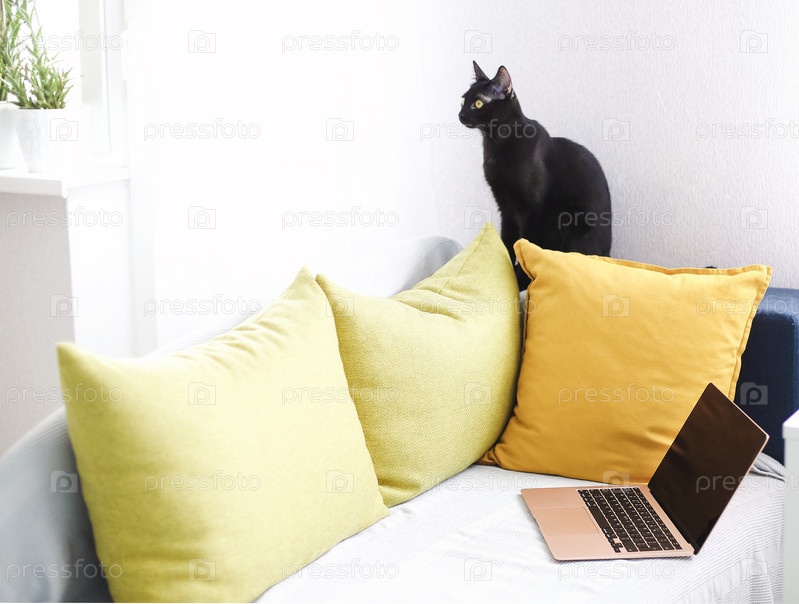 Черный кот на диване с подушками и пледом