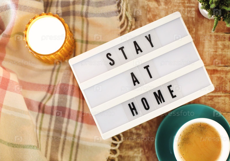 Доска с надписью «Оставайся дома», чашка кофе, горящая свеча и плед на деревянном фоне