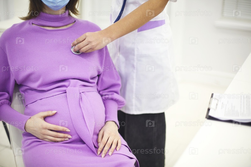Врач слушает сердцебиение беременной женщины стетоскопом во время дородового ухода в больнице