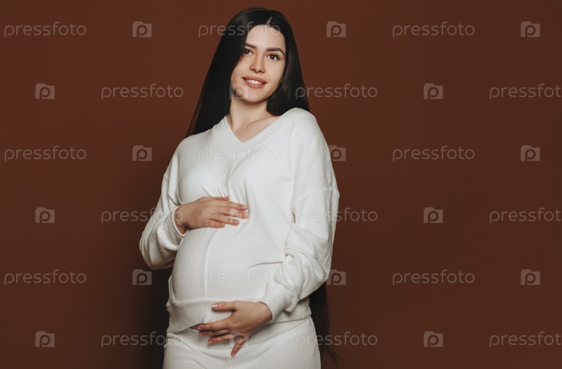 Молодая счастливая беременная женщина с длинными каштановыми волосами