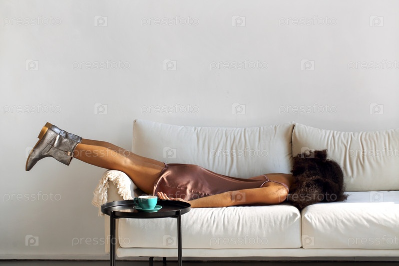 Фото уставшей сонной африканской девушки, лежащей лицом вниз на диване возле стола с кофейной чашкой