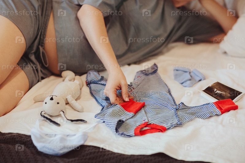Беременная женщина смотрит на очаровательную одежду для новорожденных, отдыхая дома, готовясь к родам